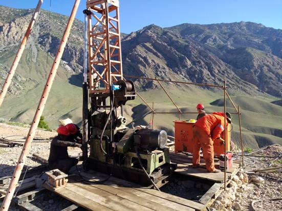 我队领导班子高度重视该项目,从工作人员出国、设备采购、工程进度、项目部人员工作状况等多方面全力支持和关注,全程指挥部署工作。上钻前,项目部人员连续驱车24小时,从吉国首都比什凯克赶往卡瓦依施工现场,成功赶在暴雨来之前扎好帐篷。为了赶进度,大家不分昼夜加班加点,由于地势陡峭、位置偏远的原因,缺乏机械协助,大家仅用了3天时间就纯粹靠人工挖出来一个8m×5m×3.7m的平台,在之后的一周内,项目部全体职工克服了缺电、缺水、缺乏机械协助等诸多困难,相继完成了200m水路电路的接通、钻机重新组装、试水、试电及钻机安装等工作,在到达施工现场第8天顺利迎来了2018年首钻。