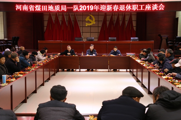1月22日,我队在新郑基地自然资源培训中心的职工活动中心大会议室召开了2019年迎新春退休职工座谈会,党委书记、队长燕建设,党委副书记、副队长刘允岭,纪委书记、工会主席杜海威与80名退休职工欢聚一堂,大家畅所欲言,共话一队发展大计,喜迎新春。